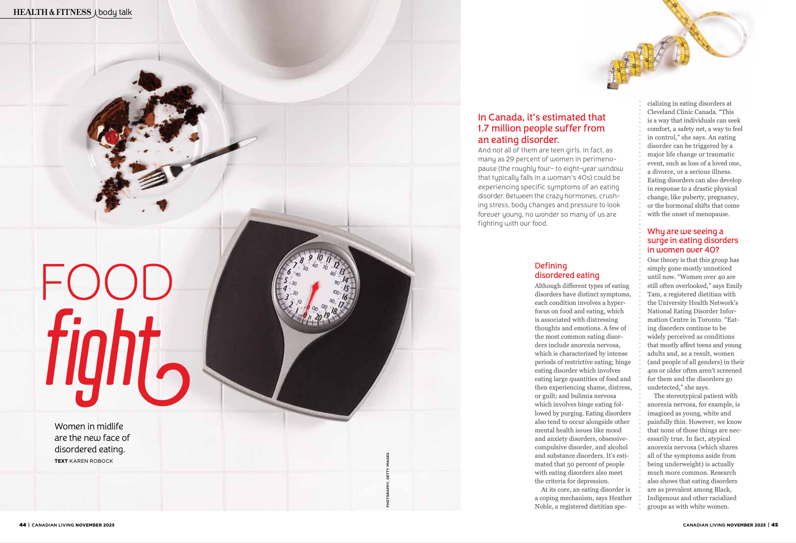 food fight Feb 19 Written By Karen Robock Women in midlife have become the new face of disordered eating. Canadian Living, November 2025. Karen Robock
